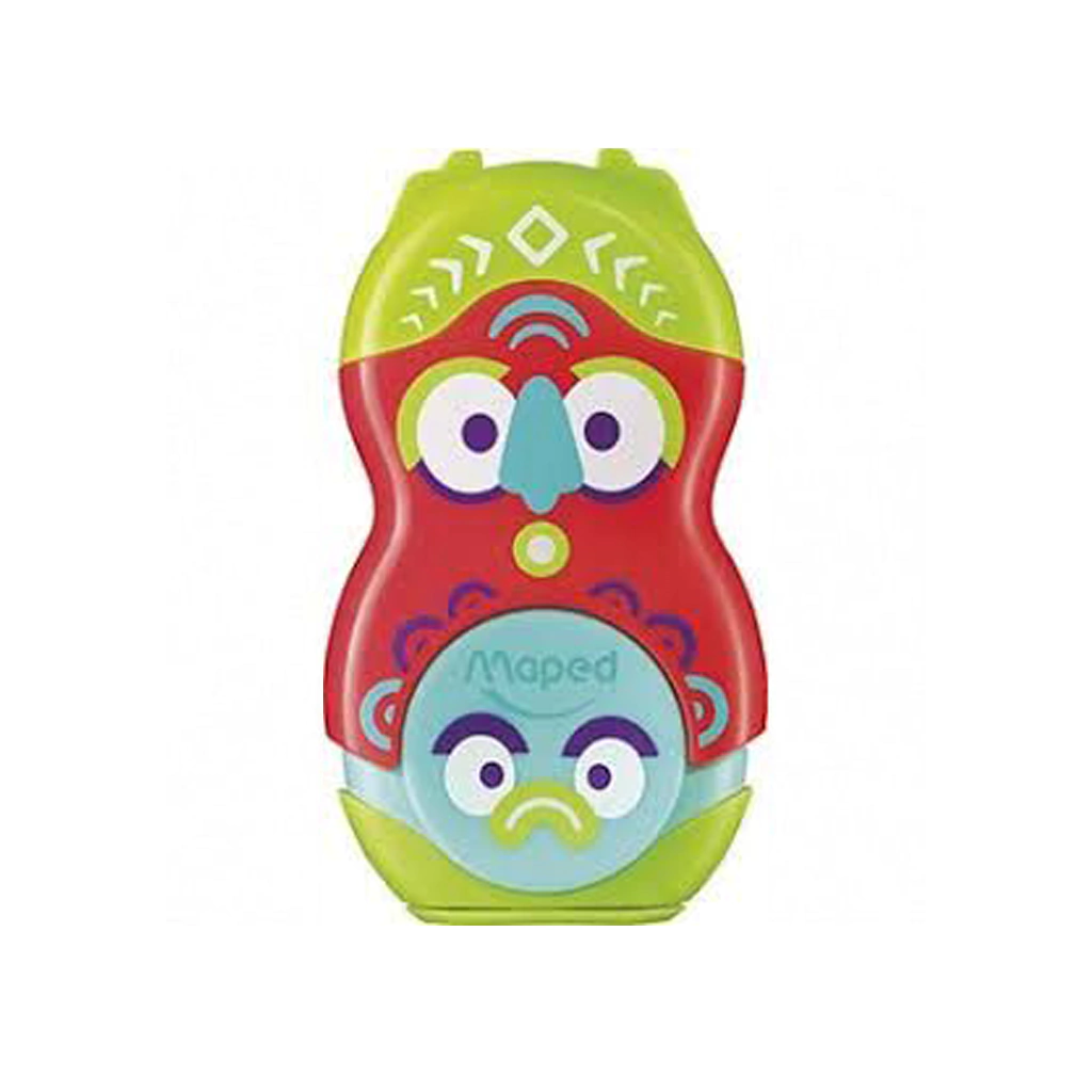 Un nuevo concepto que combina sacapuntas con recipiente y goma en un solo producto. Disponible en versión traslúcida, mate o con decoración Totem, para que elijas el que más te guste. Goma sin PVC rotativa 100 % protegida gracias a su capuchón de protección