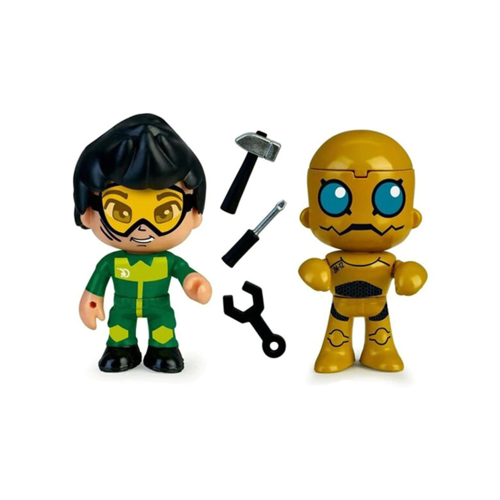 Set de 2 Figuras Pinypon Action: un malvado mecánico inventor junto con el peligroso robot que él ha creado. Incluyen varios pequeños accesorios; pequeñas herramientas del mecánico.